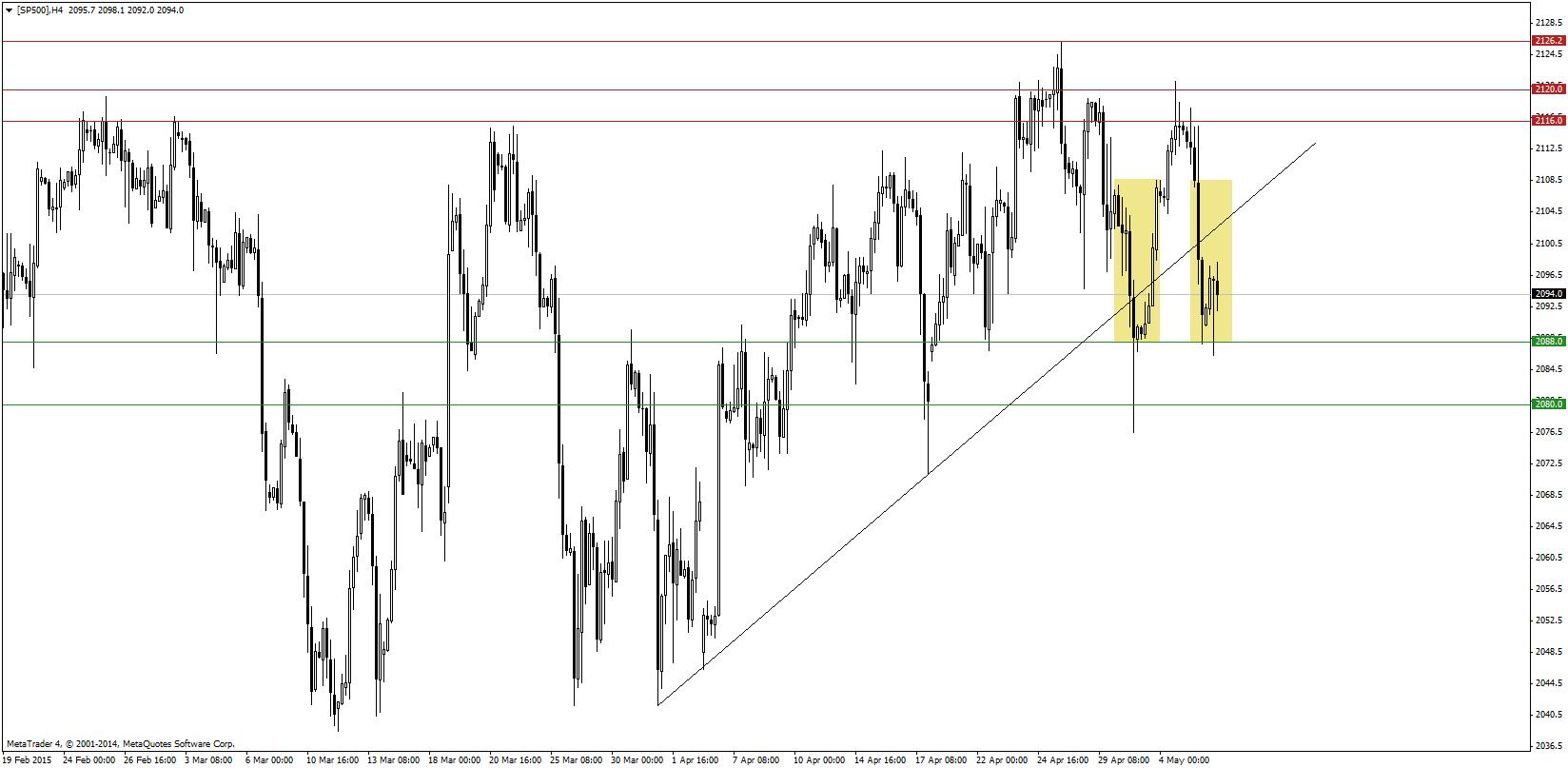 Choć ze średnioterminowego punktu widzenia nie da się zaprzeczyć wciąż przedłużającej się konsolidacji, to jednak w czterogodzinnym interwale sytuacja na indeksie 500 największych spółek USA prezentuje się naprawdę interesująco. Do końca powoli dociera budowa formacji podwójnego dna. Wykres znajduje się 6 punktów poniżej wsparcia wyznaczonego przed te właśnie dołki. W okolicy poziomu 2100 znajduje się zniesiona przez ostatnią korektę linia trendu wzrostowego trwającego od początku kwietnia. Jej przełamanie może być silnym sygnałem dla byków, które dostaną kolejną szansę na przełamanie oporu 2116 oraz górnego ograniczenia konsolidacji czyli 2120 pkt. Wówczas będziemy mogli liczyć na wyznaczenie nowego historycznego maksimum, które aktualnie znajduje się na wysokości 2126,2 pkt. Do tego poziomu stronie popytowej pozostaje zaledwie nieco ponad 30 punktów (1,5%). Wzrost tej wielkości nie byłby niczym zaskakującym.