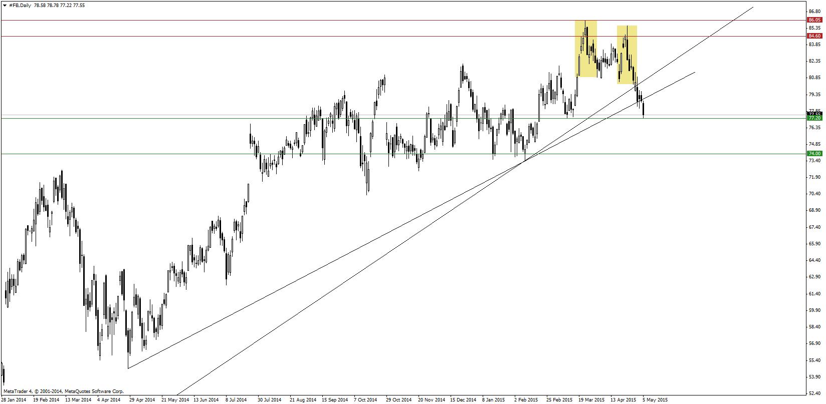 Ciekawie prezentuje się wykres najpopularniejszego serwisu społecznościowego świata. Widzimy na nim budowaną od połowy marca formację podwójnego szczytu. Dzięki niej niedźwiedziom udało się przełamać linie trendu wzrostowego. Teraz wykres dotarł do wsparcia 77,2. Jego ewentualne zniesienie powinno dodać dużo energii stronie podażowej. Ceną docelową będzie wówczas wsparcie z pierwszych dwóch miesięcy tego roku czyli cena 74 dolarów za jedną akcję. Obserwowane spadki spowodowane są słabszymi od zeszłorocznych wynikami za pierwszy kwartał. Mimo, że przychody wzrosły o ponad 40% k/k, to niższe niż w pierwszym kwartale 2014 roku okazały się zysk operacyjny, zysk netto, zysk na akcję oraz marża operacyjna. Nadzieje inwestorów zostały rozwiane głównie za sprawą mocnego kursu dolara, który mocno uderzył w wyniki Facebook’a.