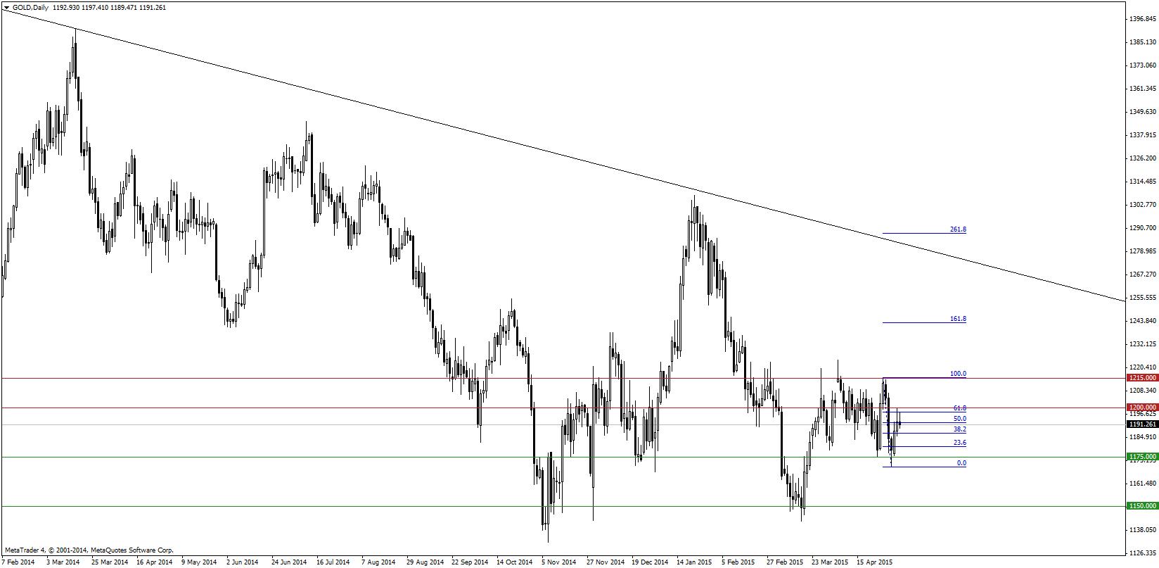 Od przeszło miesiąca cena złota konsoliduje się wokół psychologicznego poziomu 1200 USD za uncję. Aktualnie wynosi ona nieco ponad 1191 USD. Ewentualne przełamane poziomu 1200 może pozwolić na kolejny atak na górne ograniczenie konsolidacji czyli 1215 USD za uncję. Zanim jednak to nastąpi byki będą musiały poradzić sobie ze zniesieniem 50% oraz fibo 61,8 powstrzymującymi wzrosty od początku tygodnia. Zakończenie konsolidacji nie wydaje się jednak na razie zbyt prawdopodobne.