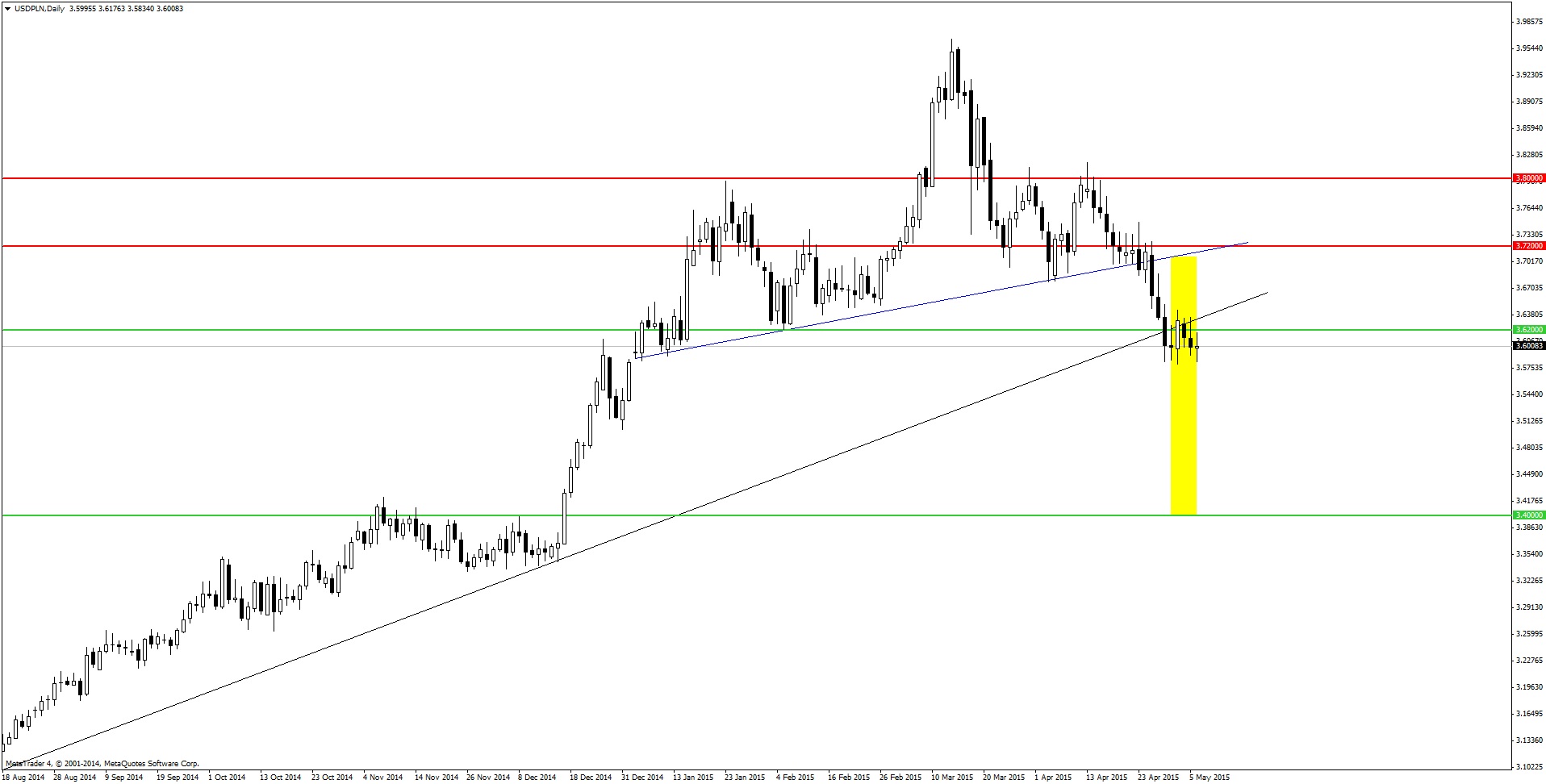 Mocne odbicie obserwujemy na parach z dolarem amerykańskim, również w stosunku do polskiego złotego. Na wykresie dziennym widać formację RGR, której zasięg to nawet okolice 3,40; co jeszcze kilka tygodni temu było wręcz niemożliwe. W minionym tygodniu została przełamana linia trendu wzrostowego, a obecnie trwa korekta i kurs konsoliduje się w okolicach 3,60. Obrona poziomu 3,62 – 3,63 otworzy drogę do dalszych spadków, oczywiście w połączeniu z dalszym odbiciem na eurodolarze, co jest bardzo prawdopodobne ze względu na napływające słabe dane za oceanu.